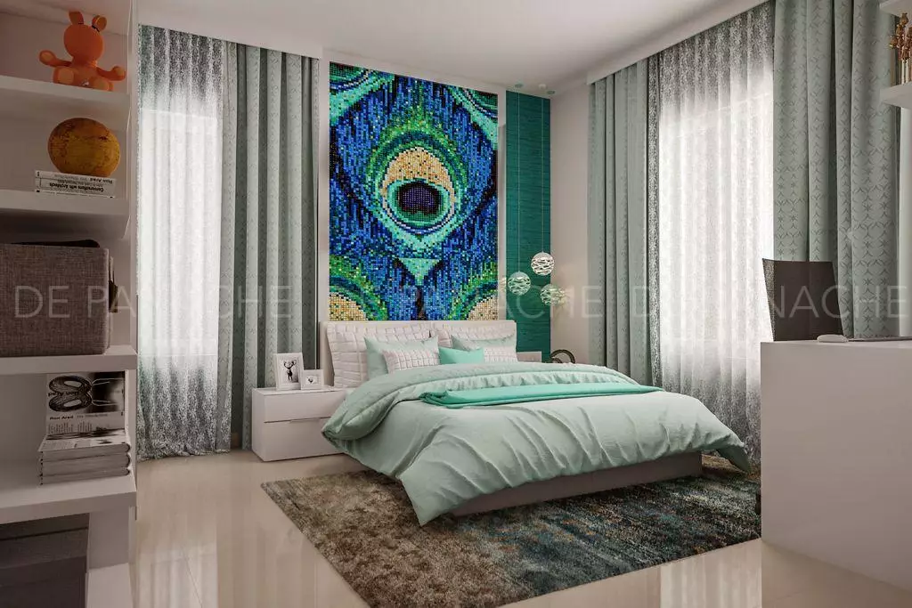 Coming to the master bedroom, we have finished its look in beige and brown twining with it the German wooden flooring in a Herringbone pattern gives it a rich look. The backdrop of the king-size bed has been covered by fabric textured vinyl based wall coverings wood with a metal strip in burnt gold inlaid in it. Burnt golden balls hanging from above make the whole décor look more attractive. We have also broken the typical idea/ image of a kid’s room and completed the room in a typical contemporary style. In the various hues of blue, the whole bedroom has extravagant designs and bold attitude. The backdrop of their daughter’s bedroom has been finished with an extraordinary design of Handcut Glass Mosaics depicting the intricacies of a train of a peacock. The study unit is also not an ordinary one. Asymmetrical boxes have been put in a playful manner and in varying depths put the varieties in a single form. The whole interior gets beautiful reflections through various lights in every corner. The bedrooms are designed with clean lines and simple details, using strong textures to create an impact. Thus, the entire house bears the stamp of a decorator with a keen eye, unconventional tastes, and the ability to see potential in any space.