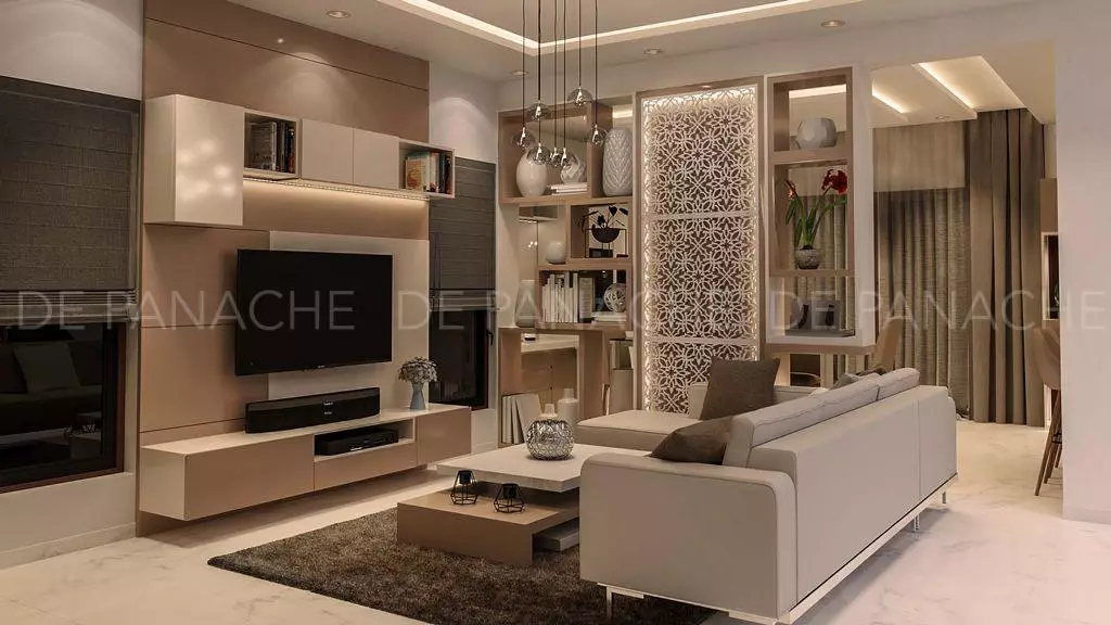 At the verandah we have put shoe rack seating niches to break the monotony of the typical shoe rack design, giving it a mirror edge to keep the knick-knacks. The whole living room has been completed in the soft tones of white and light brown, which provides a magmatic look for the entire décor. Complementing the shades are the lightings that enhance the beauty of the interior. Handmade stones paired with cove lights and mood lights are given to highlight the whole space. False ceiling and asymmetrical storage capacities have given the place the beauty to admire. The cove lights in between lighten up the entire area and create the perfect peace of mind and rest. The wall coverings to the centre table mark a difference and twin with the whole décor.