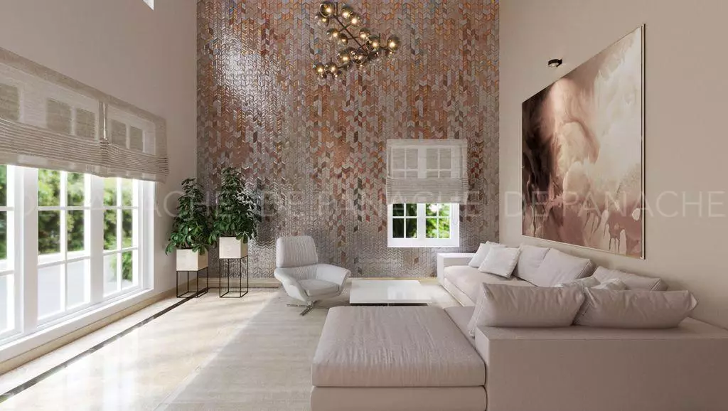 Elegance is an understatement here we have tried to put the intricate details of the flower. Through the hand-cut glass mosaics, the experts at De Panache, one of the best interiors of Bangalore has tried to depict the petals of a flower all joining together to make the accent wall look like a beautiful flower in the various shades of grey, ash, beige and white. The colors together paint the beauty on the wall. The background of the accent wall has been covered with a Vinyl based wall covering which is quite unique and it gives an exceptional look to the whole interior.